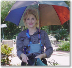 Yes, that really is a hands free umbrella – velcro is a wonderful thing.